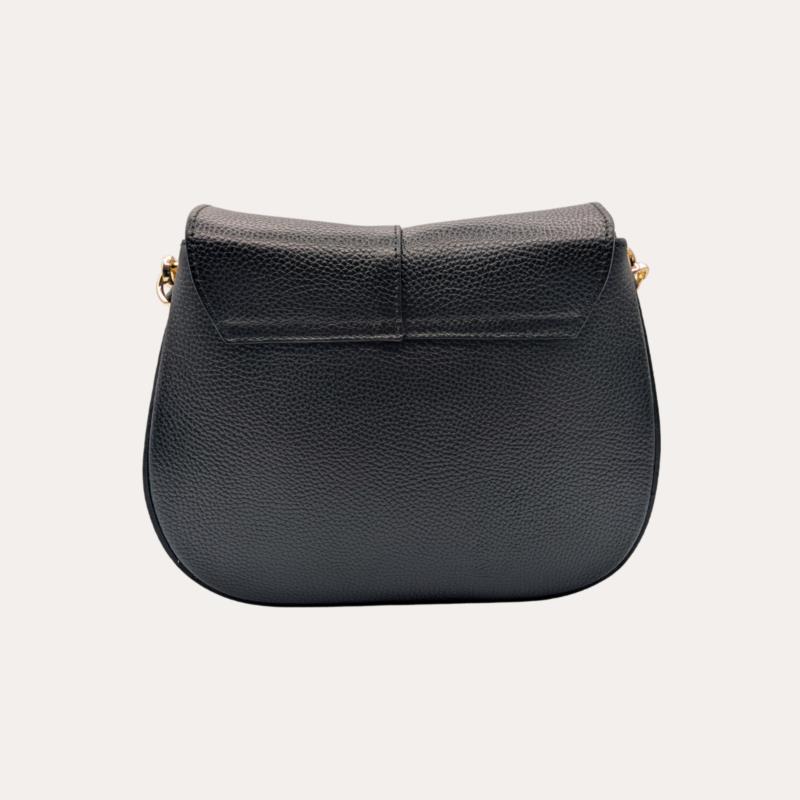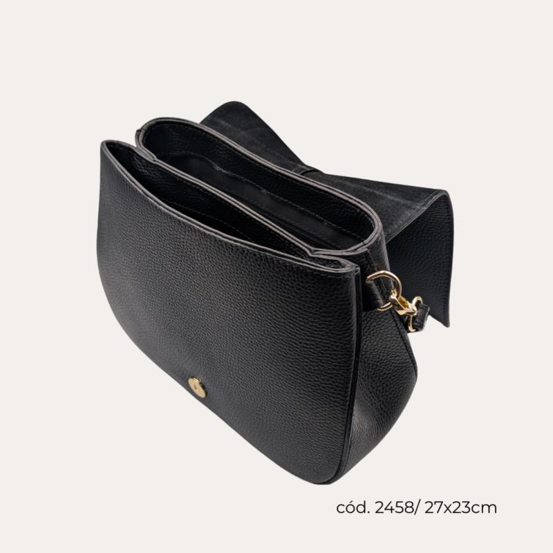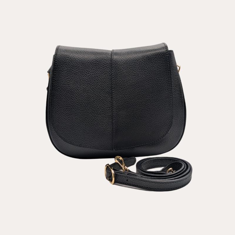 Bolso bandolera Negra para mujer de diseño semicircular y líneas limpias, perfecto para un estilo elegante y atemporal. Confeccionado en acabado texturizado de piel , combina sofisticación y resistencia, convirtiéndose en un básico imprescindible en cualquier armario. Incorpora correa ajustable y extraíble con herrajes dorados, permitiendo llevarlo al hombo o cruzado según la ocasión. Con unas medidas aproximadas de 24 cm de ancho x 22 cm de alto x 8 cm de fondo, ofrece espacio ideal para organizar tus esenciales diarios con comodidad. Un complemento versátil, práctico y fácil de combinar, ideal para looks urbanos y de oficina en el mercado español.