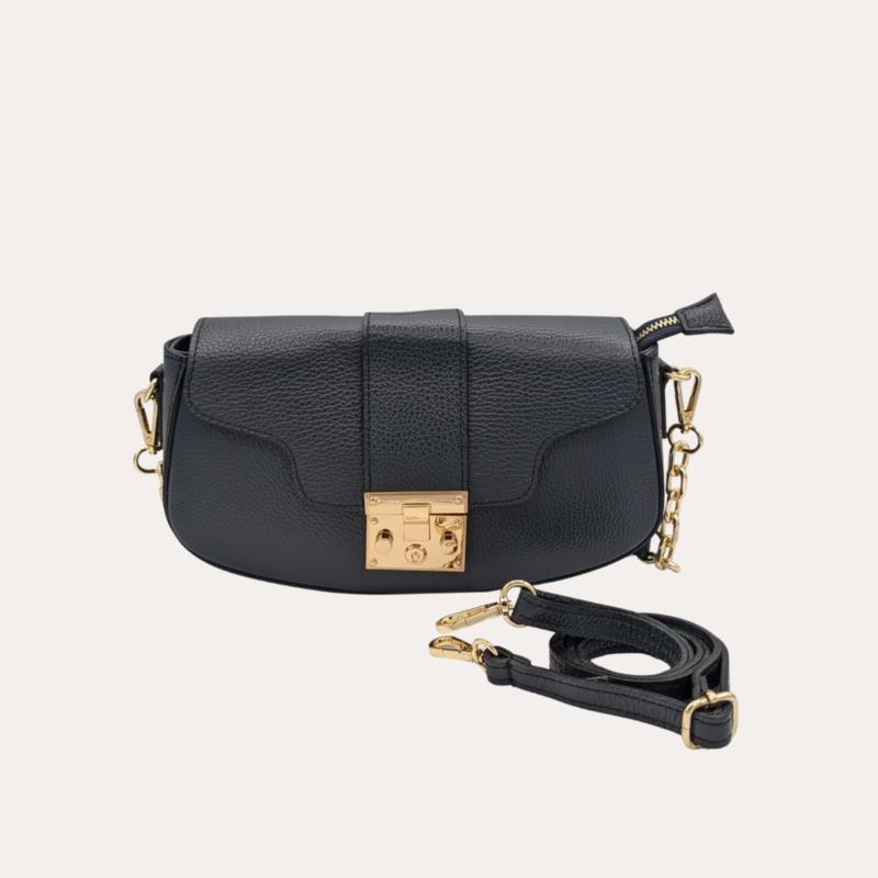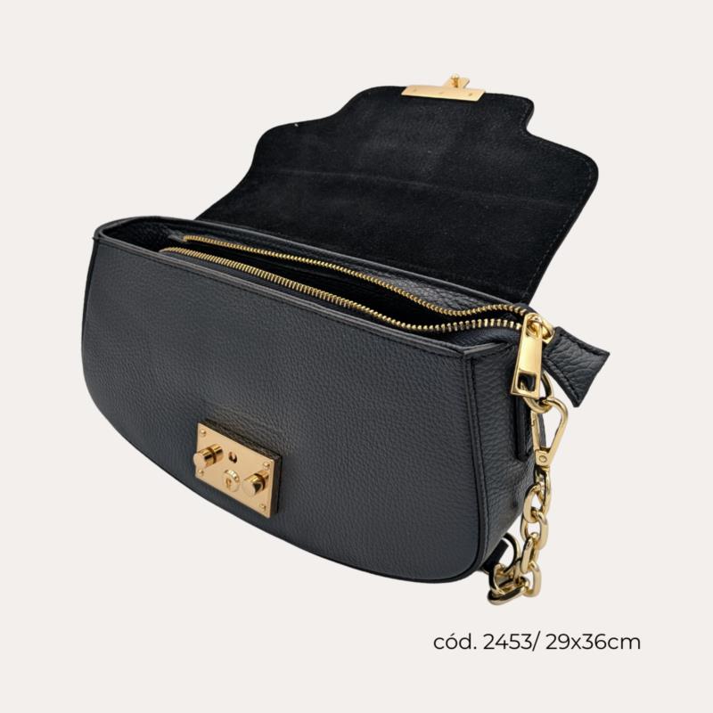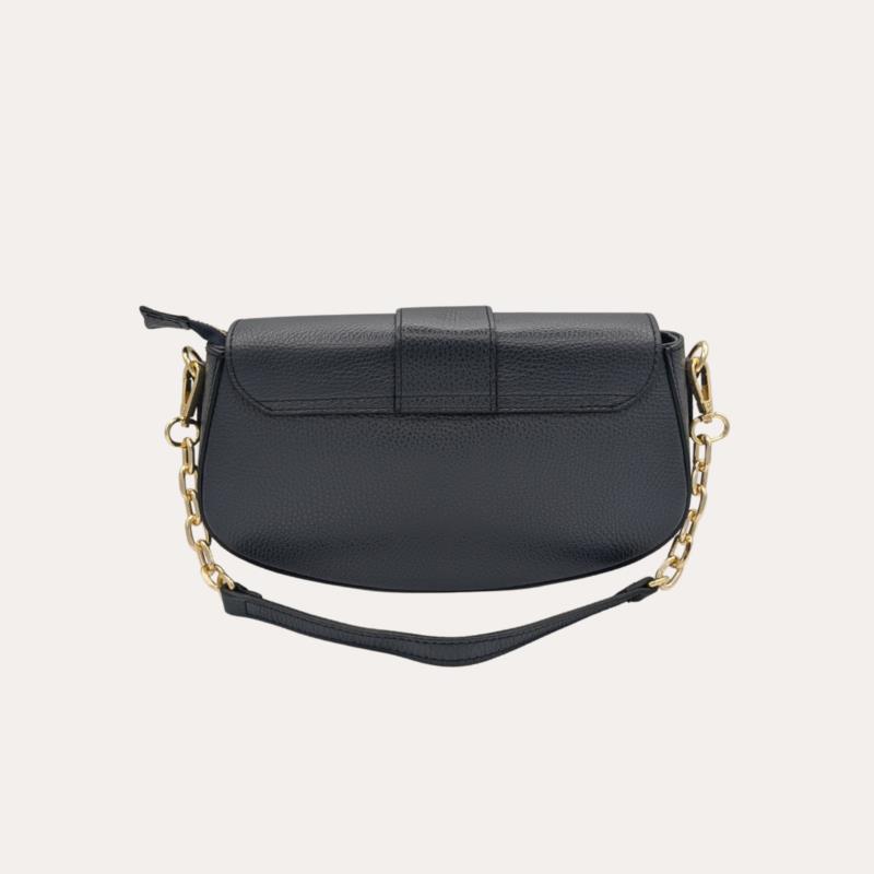 Bolso bandolera negro para mujer con diseño elegante y contemporáneo, confeccionado en acabado texturizado en piel que aporta sofisticación y durabilidad. Su estructura compacta con solapa frontal y cierre metálico dorado le da un aire refinado, ideal para complementar looks tanto de día como de noche. Cuenta con correa ajustable y cadena decorativa dorada , que añade un toque moderno y permite llevarlo cómodamente al hombro o cruzado . Con unas medidas aproximadas de 24 cm de ancho x 20 cm de alto x 6 cm de fondo, ofrece espacio suficiente para organizar tus esenciales diarios. Un bolso versátil, elegante y fácil de combinar, imprescindible en cualquier armario femenino. ?