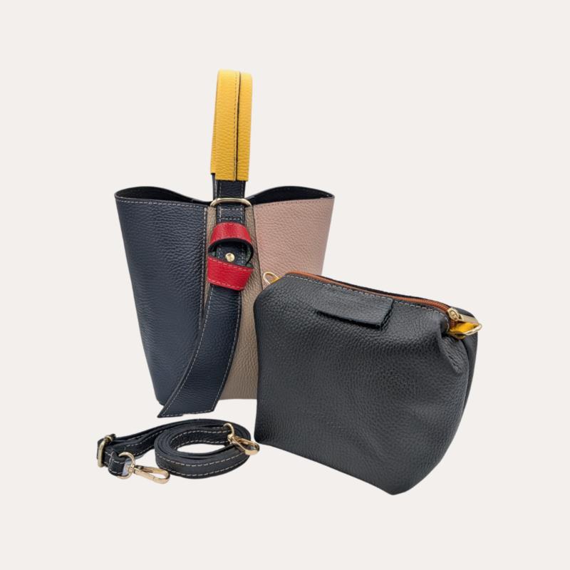 Bolso tote para mujer de diseño minimalista y elegante, confeccionado en piel, un acabado que aporta un estilo moderno y atemporal. Su estructura trapezoidal y su asa superior reforzada le dan carácter y versatibilidad por la manera de ajustarlo internamente de dos fromas , mientras que la correa larga ajustable y extraíble permite llevarlo cómodamente al hombro o cruzado . Con unas medidas aproximadas de 24 cm de alto x 20 cm de ancho x 13 cm de fondo, ofrece capacidad ideal para el día a día e incluye neceser interior extraíble para una mejor organización. Un bolso versátil y sofisticado, perfecto para looks urbanos, de oficina o casual chic en el mercado español. Colores : Azul Oscuro, Nude, Topo y Marrón.