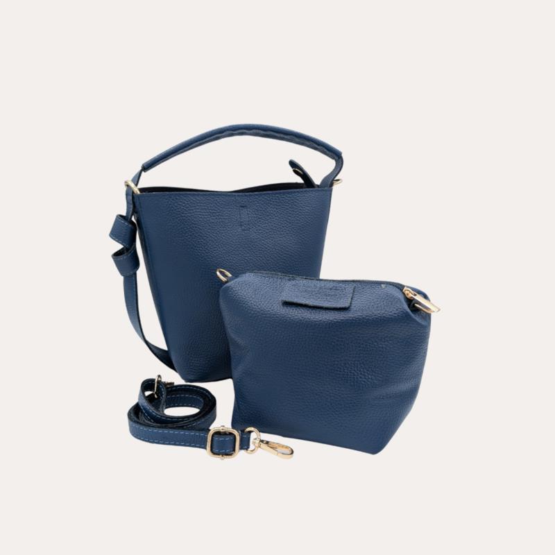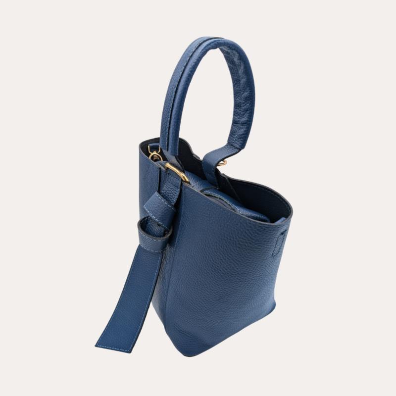 Bolso tote azul para mujer de diseño minimalista y elegante, confeccionado en piel, un acabado que aporta un estilo moderno y atemporal. Su estructura trapezoidal y su asa superior reforzada le dan carácter y versatibilidad por la manera de ajustarlo internamente de dos fromas , mientras que la correa larga ajustable y extraíble permite llevarlo cómodamente al hombro o cruzado . Con unas medidas aproximadas de 24 cm de alto x 20 cm de ancho x 13 cm de fondo, ofrece capacidad ideal para el día a día e incluye neceser interior extraíble para una mejor organización. Un bolso versátil y sofisticado, perfecto para looks urbanos, de oficina o casual chic en el mercado español.