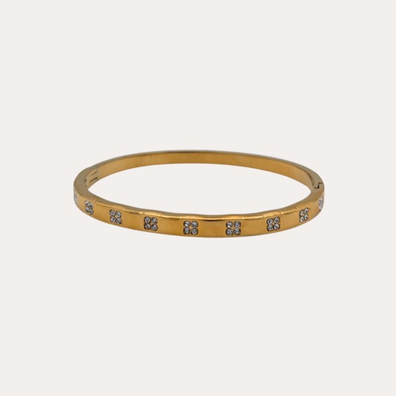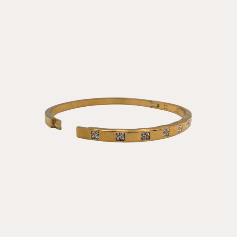Brazalete fino de acero inoxidable con acabado dorado y cristales integrados de forma regular, que aportan un brillo sutil y sofisticado. Su diseño limpio y elegante lo convierte en una pieza versátil, ideal para llevar sola o combinar con otros brazaletes finos en looks diarios o más formales.