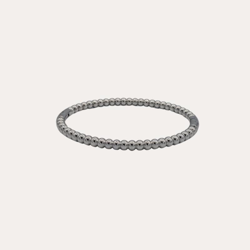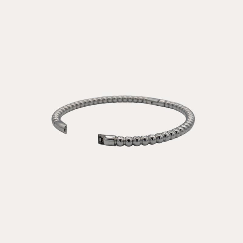 Pulsera fina de acero inoxidable en tono plateado, diseñada con una cadena de bolitas metálicas que crea un efecto delicado y moderno. Su estilo minimal la convierte en un básico versátil, perfecto para el día a día o para completar combinaciones de pulseras con un acabado sofisticado.