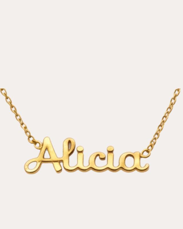 Collar ajustable delicado y actual con el nombre “Alicia” en acabado dorado , elaborado en acero inoxidable de alta calidad. Su diseño personalizado aporta un toque íntimo y especial, ideal para llevar a diario o como regalo con significado. Resistente, ligero y de estilo minimal.