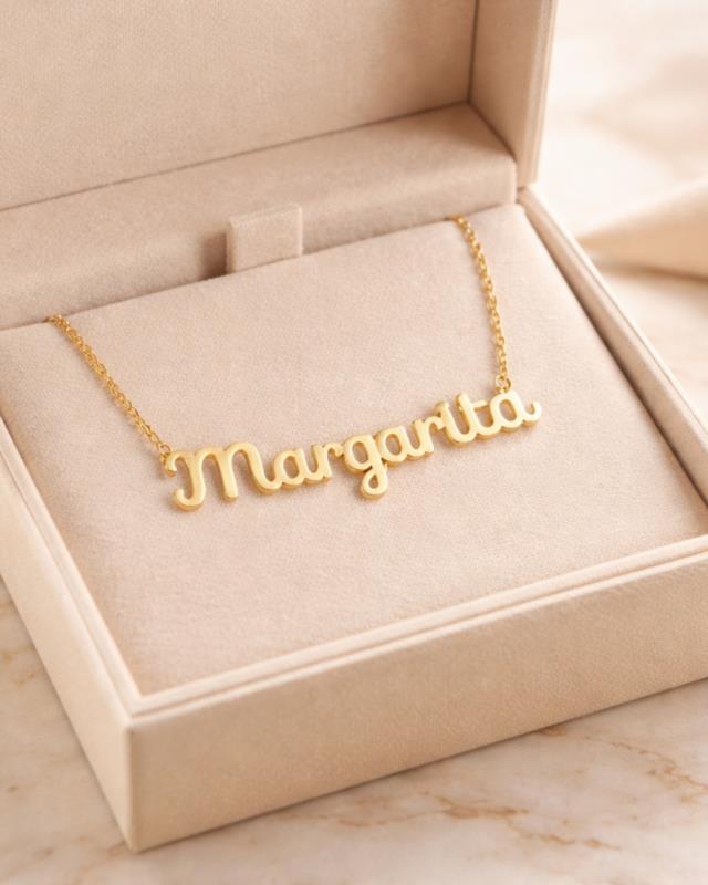 Collar ajustable delicado y actual con el nombre “Margarita” en acabado dorado , elaborado en acero inoxidable de alta calidad. Su diseño personalizado aporta un toque íntimo y especial, ideal para llevar a diario o como regalo con significado. Resistente, ligero y de estilo minimal.
