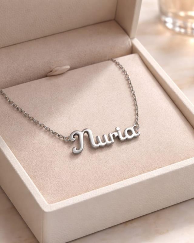 Collar ajustable delicado y actual con el nombre “Nuria” en acabado plateado , elaborado en acero inoxidable de alta calidad. Su diseño personalizado aporta un toque íntimo y especial, ideal para llevar a diario o como regalo con significado. Resistente, ligero y de estilo minimal.