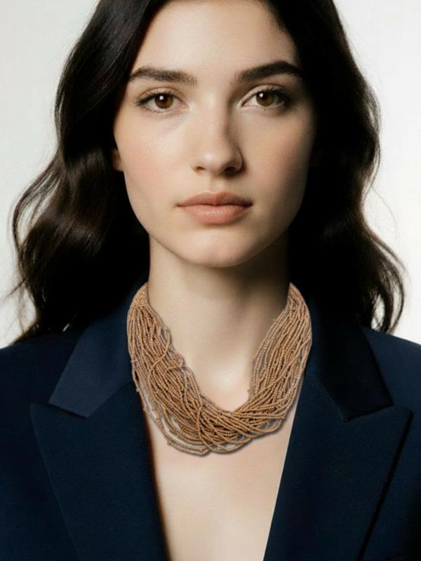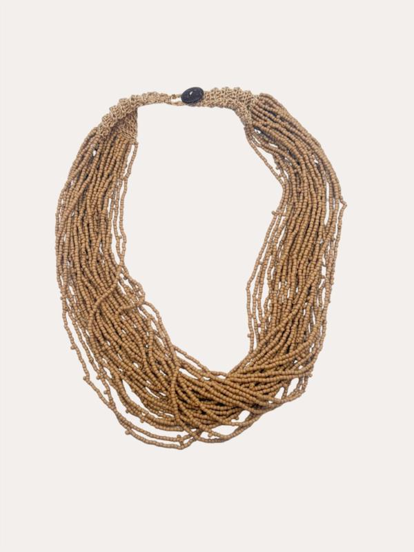 Collar multivuelta elaborado con cuentas en tono beige, que aporta textura y un estilo natural al conjunto. Su diseño envolvente lo convierte en un accesorio versátil y sofisticado, ideal para complementar looks neutros, bohemios o de inspiración artesanal.