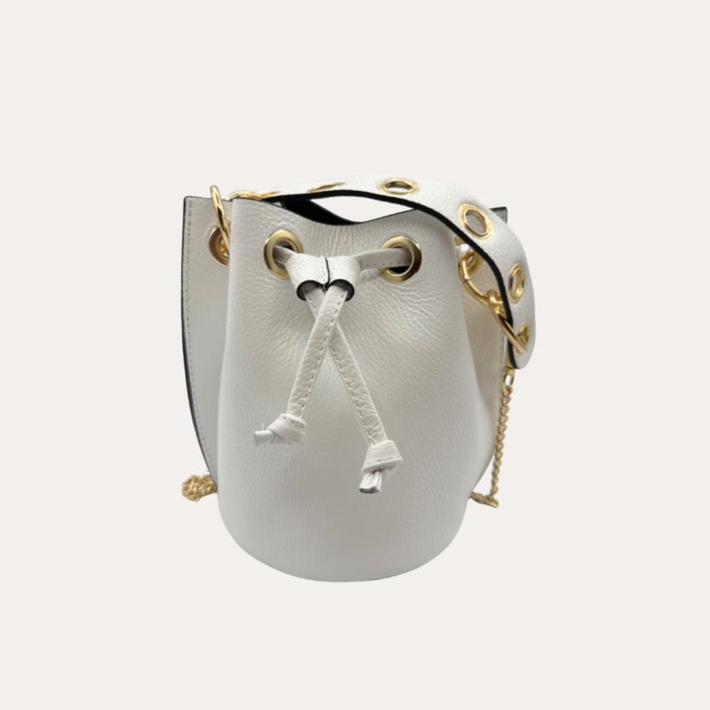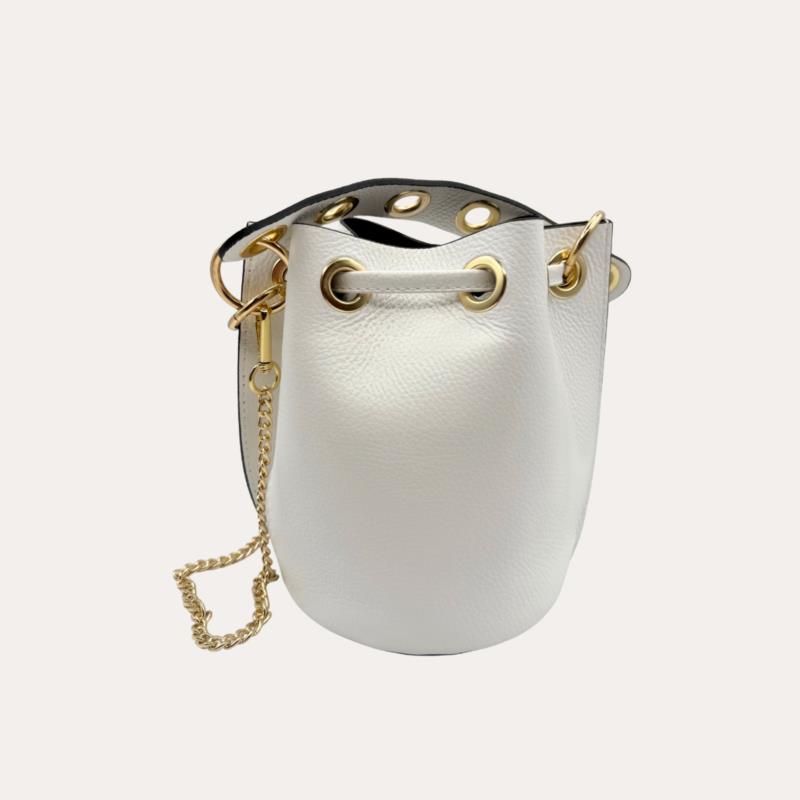 Fresco, elegante y con un toque muy especial. Este bolso bombonera de piel blanca con anillas doradas es perfecto para iluminar cualquier look y darle un aire actual y femenino. Su diseño tipo saco es cómodo, práctico y siempre favorecedor. El cierre con cordones ajustables y los detalles en metal dorado aportan personalidad y estilo, mientras que su tamaño permite llevar lo esencial de forma organizada sin resultar pesado. Puedes llevarlo al hombro o cruzado , adaptándolo a tu día a día o a planes más especiales. Su acabado en piel auténtica suave y resistente lo convierte en un bolso cómodo, versátil y fácil de combinar.