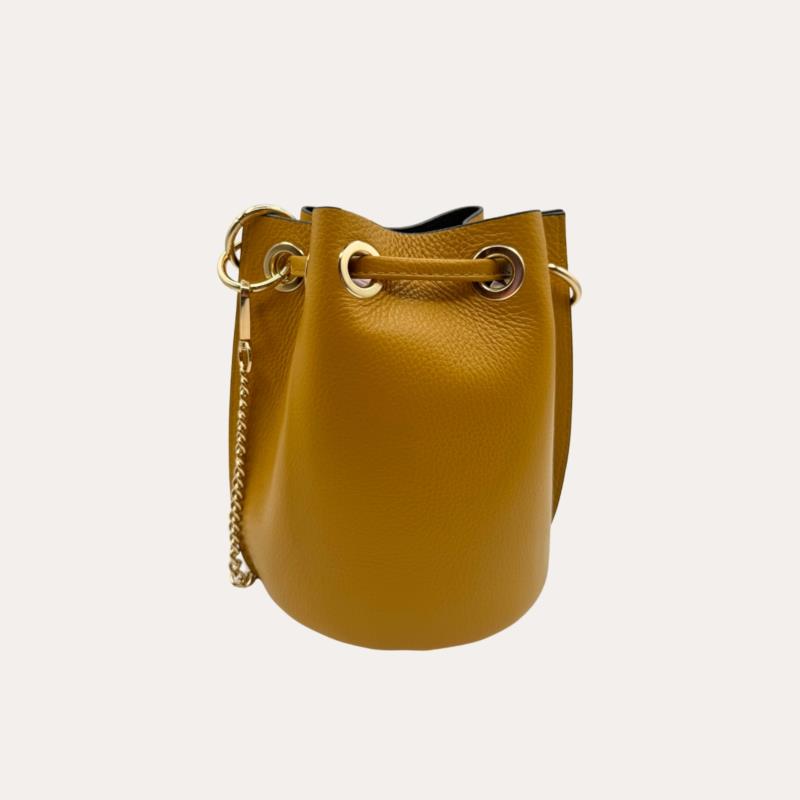 Fresco, elegante y con un toque muy especial. Este bolso bombonera de piel mostaza con anillas doradas es perfecto para iluminar cualquier look y darle un aire actual y femenino. Su diseño tipo saco es cómodo, práctico y siempre favorecedor. El cierre con cordones ajustables y los detalles en metal dorado aportan personalidad y estilo, mientras que su tamaño permite llevar lo esencial de forma organizada sin resultar pesado. Puedes llevarlo al hombro o cruzado , adaptándolo a tu día a día o a planes más especiales. Su acabado en piel auténtica suave y resistente lo convierte en un bolso cómodo, versátil y fácil de combinar.