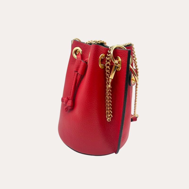 Fresco, elegante y con un toque muy especial. Este bolso bombonera de piel roja con anillas doradas es perfecto para iluminar cualquier look y darle un aire actual y femenino. Su diseño tipo saco es cómodo, práctico y siempre favorecedor. El cierre con cordones ajustables y los detalles en metal dorado aportan personalidad y estilo, mientras que su tamaño permite llevar lo esencial de forma organizada sin resultar pesado. Puedes llevarlo al hombro o cruzado , adaptándolo a tu día a día o a planes más especiales. Su acabado en piel auténtica suave y resistente lo convierte en un bolso cómodo, versátil y fácil de combinar.