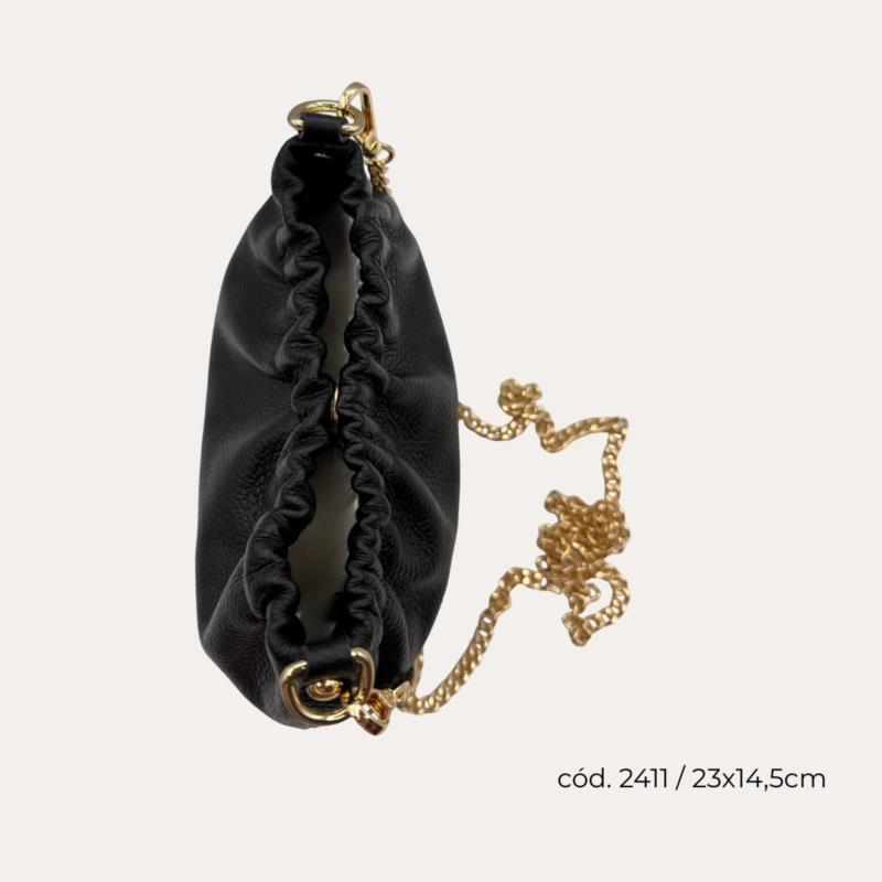 Elegante, femenino y muy fácil de combinar. Este bolso pouch de piel negra con cadena es el complemento ideal para dar un toque sofisticado a cualquier look. Su diseño suave y actual lo convierte en una pieza especial que eleva incluso los estilismos más sencillos. El detalle de la cadena dorada aporta luz y estilo, mientras que su formato pouch permite llevar lo imprescindible de forma cómoda y ordenada. Perfecto para el día o para planes más especiales. Puedes llevarlo al hombro o cruzado , adaptándolo a cada momento. Su acabado en piel suave y resistente ofrece comodidad sin renunciar a la elegancia. Ideal para looks casuales, eventos o salidas donde quieres ir arreglada sin exceso.
