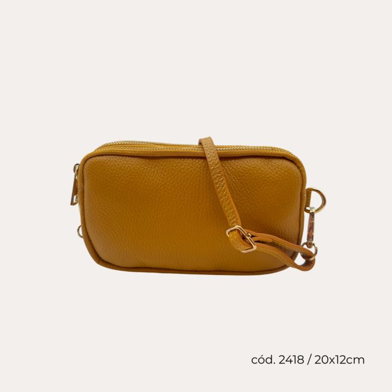Mini Bolso Piel Mostaza Mano y Hombro Tres Cremalleras
