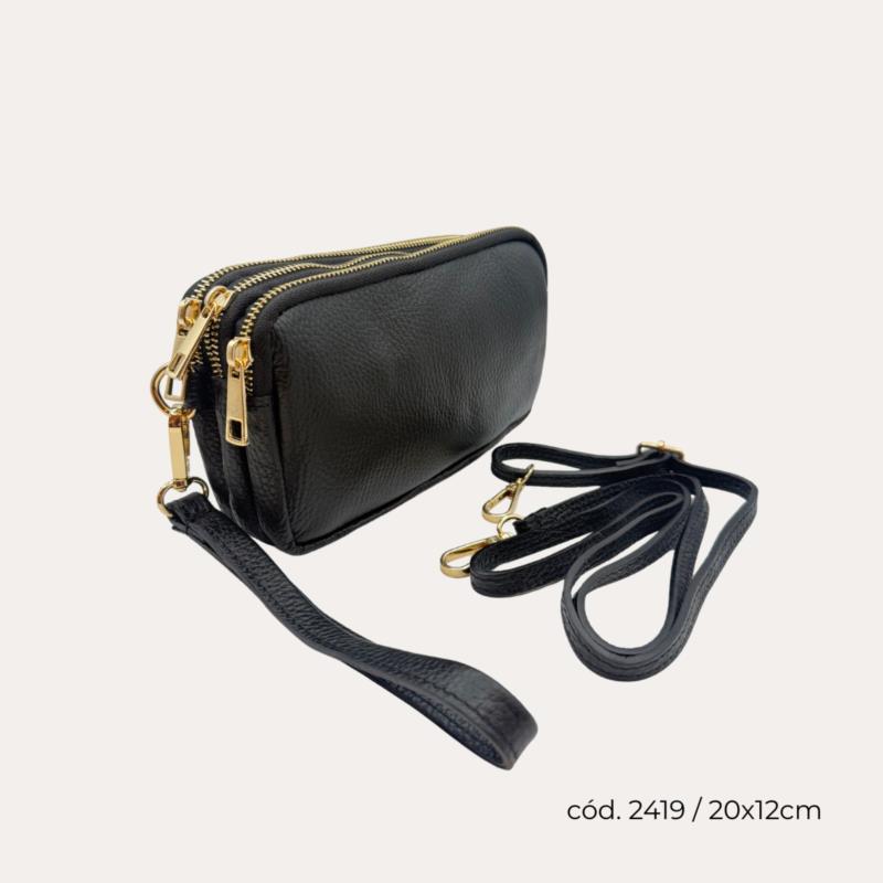 Mini Bolso Piel Negro Mano y Hombro Tres Cremalleras